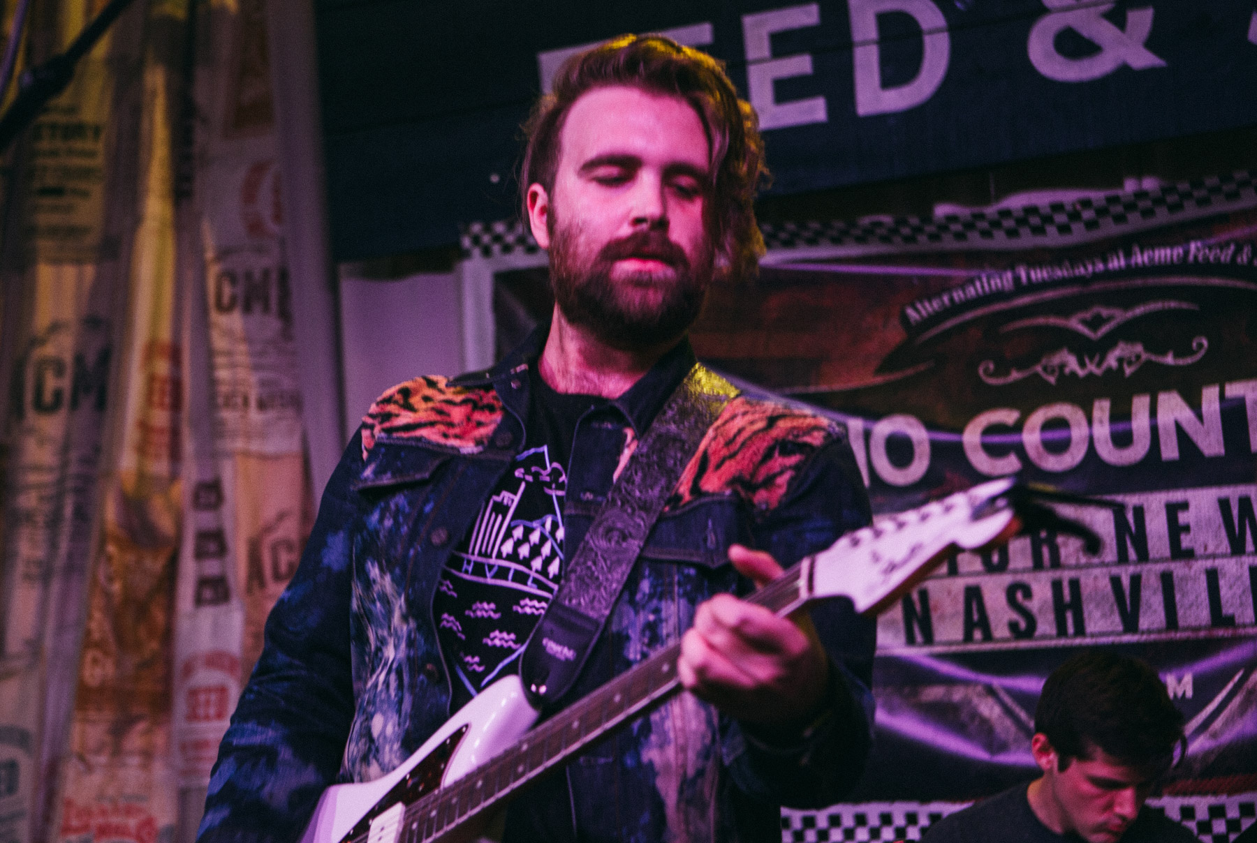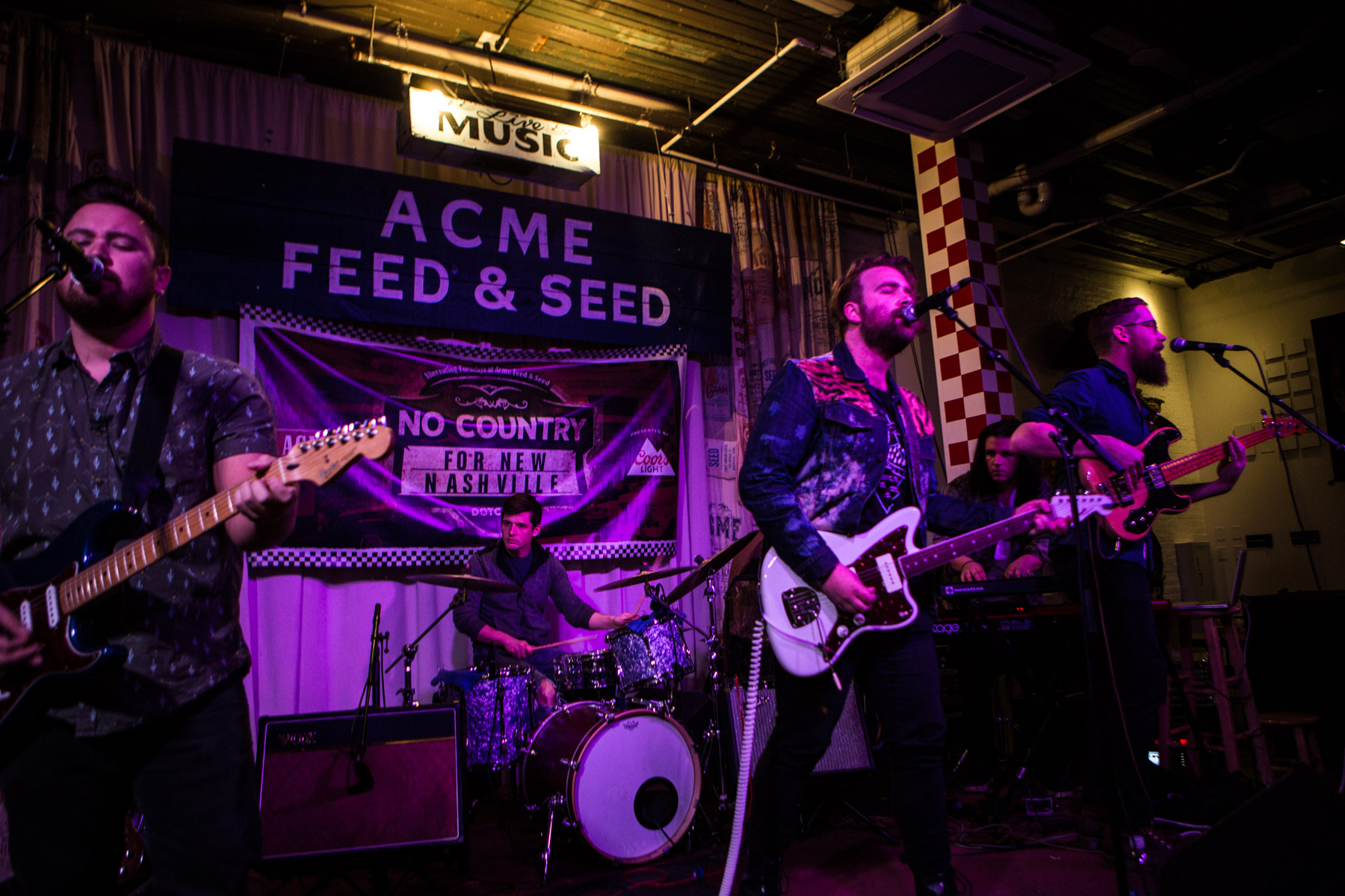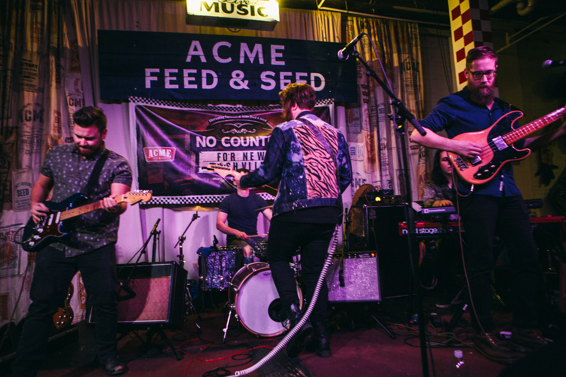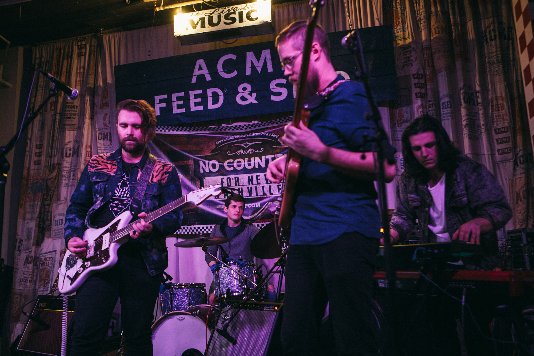 After Acme’s Carl Gatti warmed the room up, it was time for the band performance portion of our showcase to begin. First up to bat was local rocker J. Marco, who’s no stranger to No Country. We like his stuff so much we even helped him debut the track “Long Way Down”, ahead of his debut solo record release, Myth, which dropped this past October. Once you give it a listen, you may realize Marco has worked previously with local rockers New City Savages, but the new stuff reminds us more of the heavy Ryan Adams era, with his former backing band The Cardinals. Marco also has a very nice punk/grunge aspect to his music that isn’t over powering, but omnipresent, giving his brand of indie a unique flair. With a four guys backing him up, plus his chops on guitar, it was a very big sound, and when they really got it going it was pure power indie pop. We recognized his originals from his record, and he even snuck in a Springsteen cover for good measure. Who isn’t down with The Boss in quasi-apocalyptic political times like these?