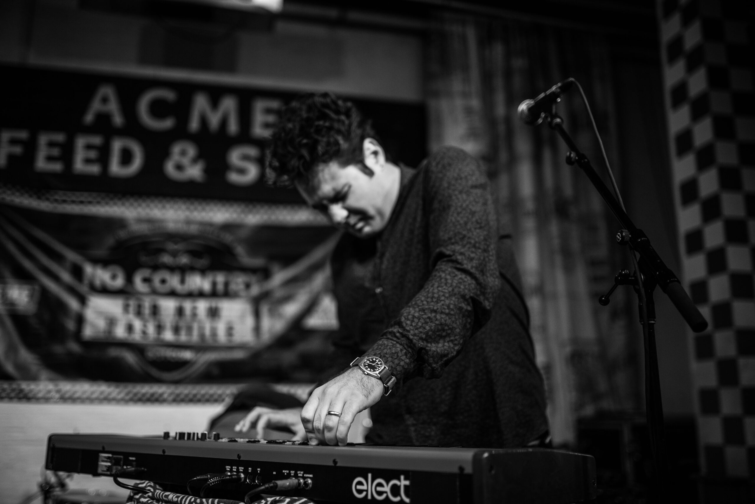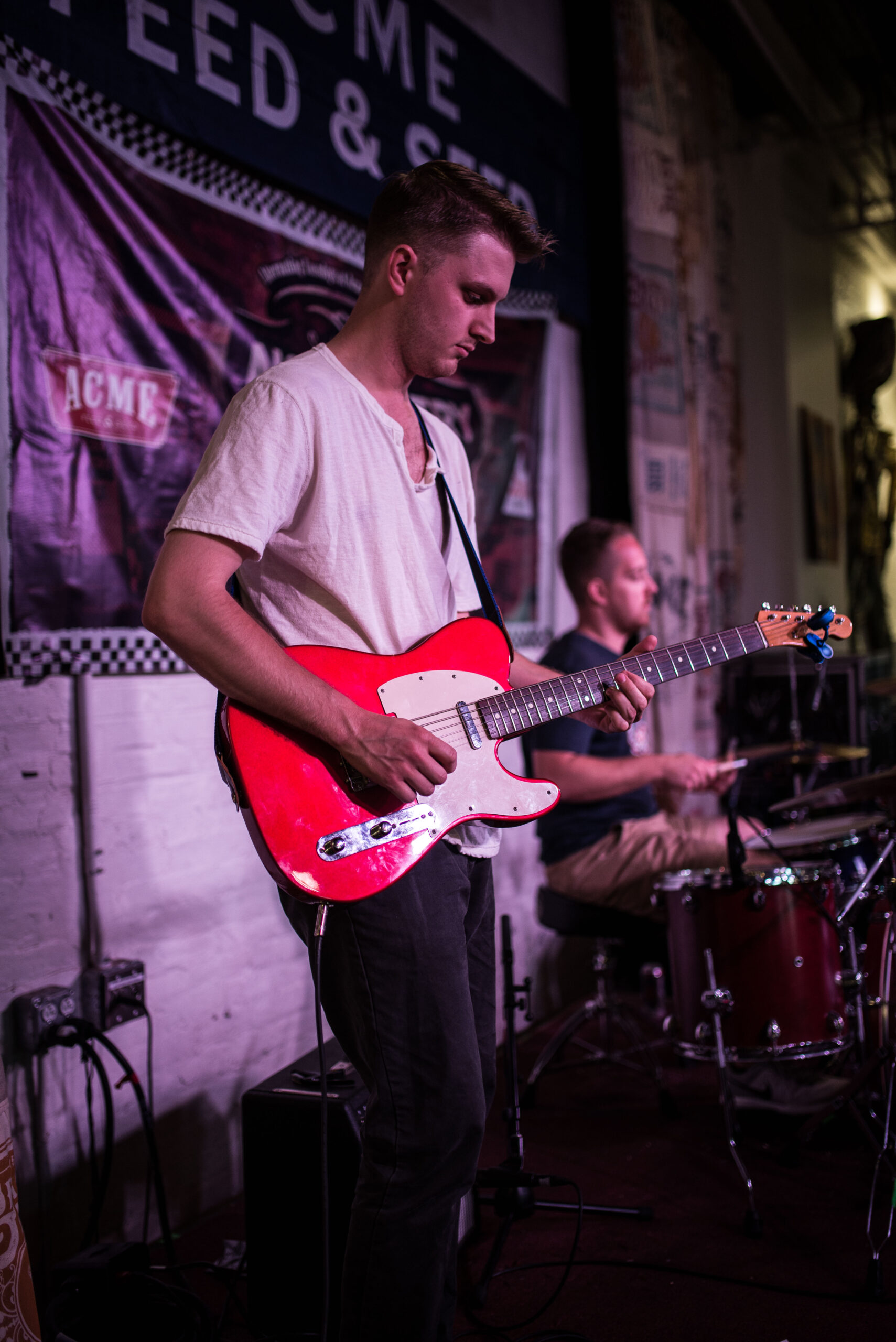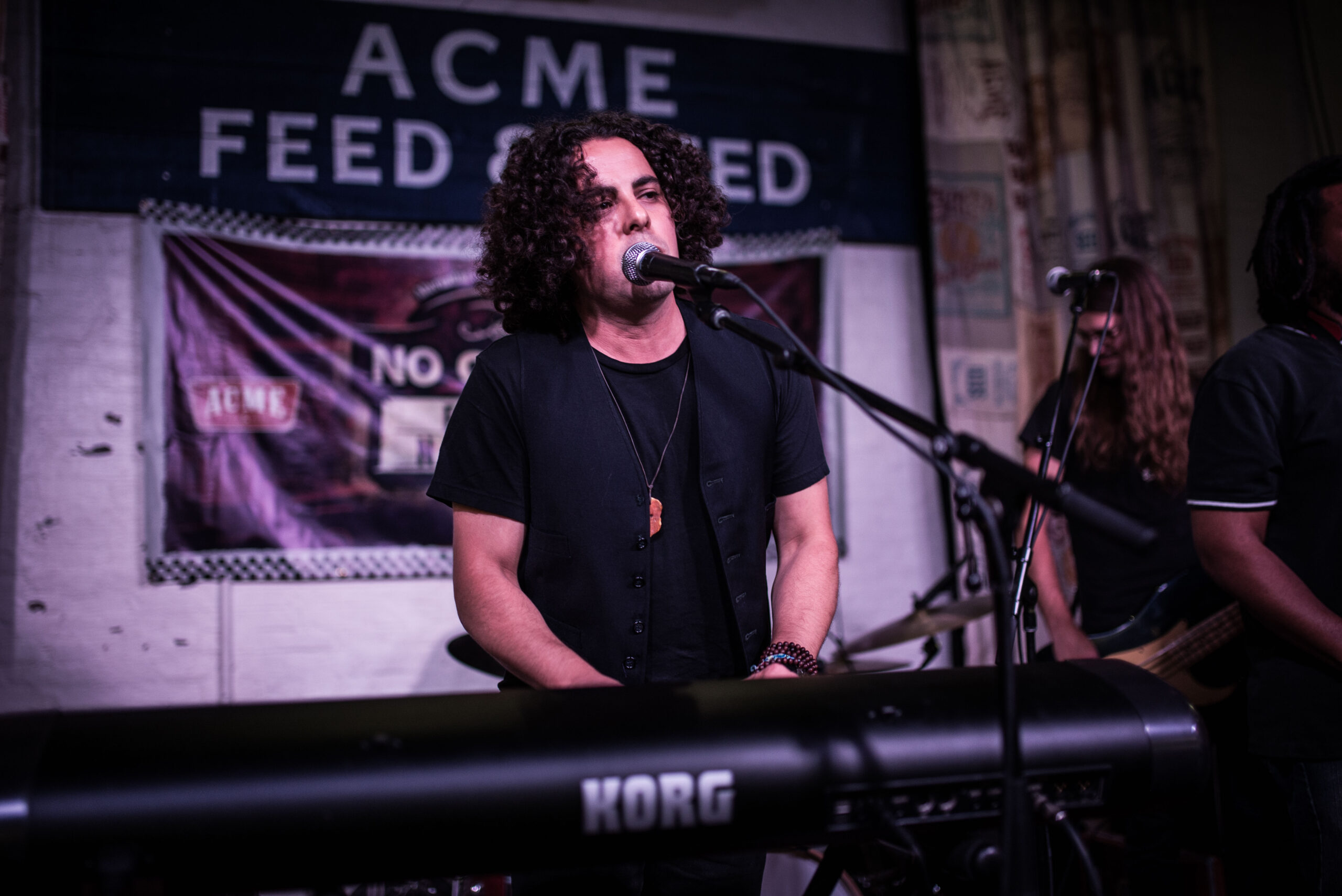 Topping off yet another great night of tunes were return performers Walking Man. They played Acme for us once already in the middle time slot, and we enjoyed them so much we asked them back as closers. This time opting for their typical two-man arrangement (the first time they performed a bassist had been added), their minimalist but profound psych folk meets LCD Soundsystem analog electronica was never clearer. Despite having just two members, their sound is huge, and it’s obvious they’ve put a lot of time into building layered songs through the keyboard and effect pedals. There isn’t a wasted moment, not a second when they aren’t intensely focused on what comes next in a particular arrangement. The lead vocal is very authoritative without being overbearing, a much oft-maligned skill, considering I’ve seen so many push their voices too hard, sounding intrusive to the harmony of any given song.