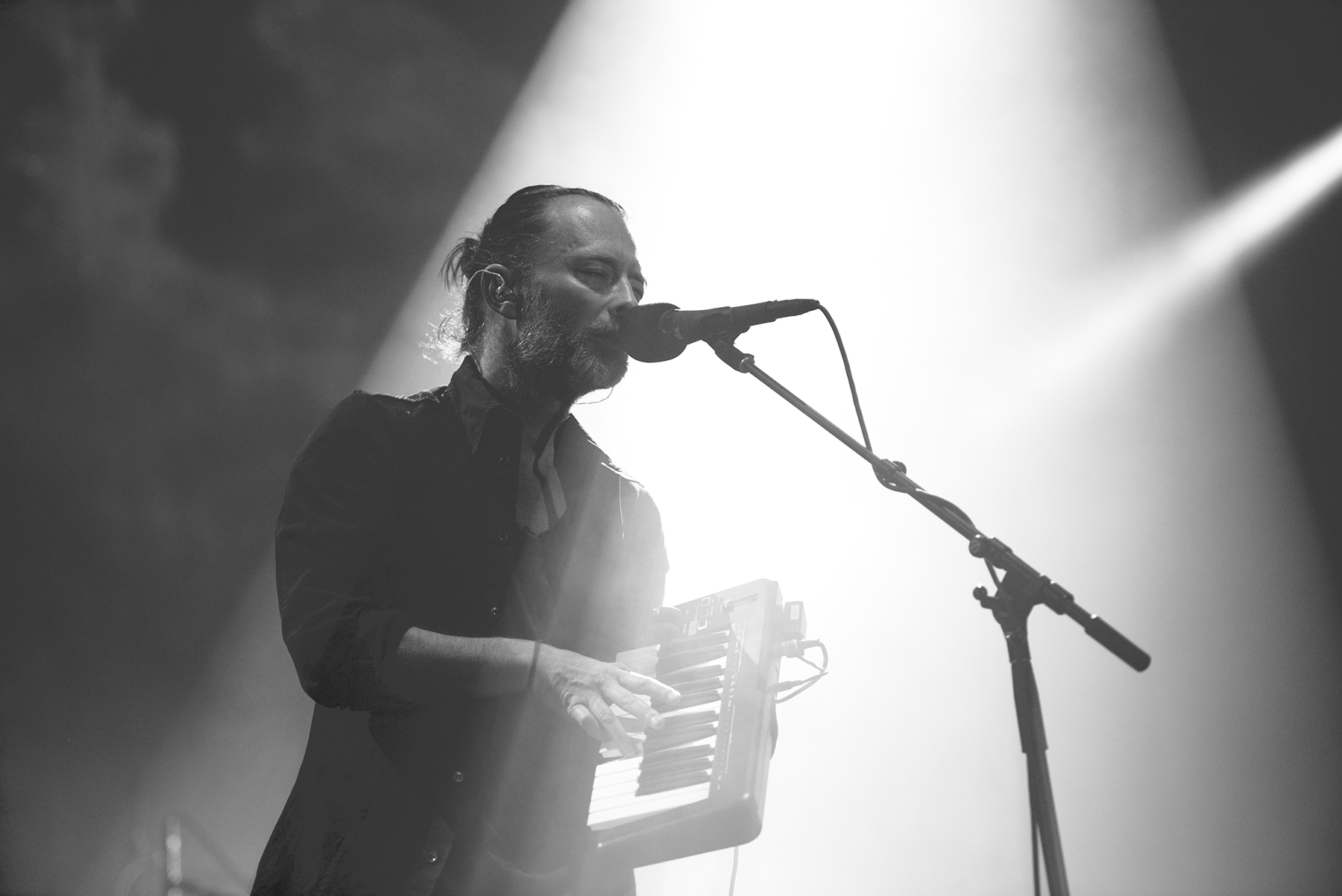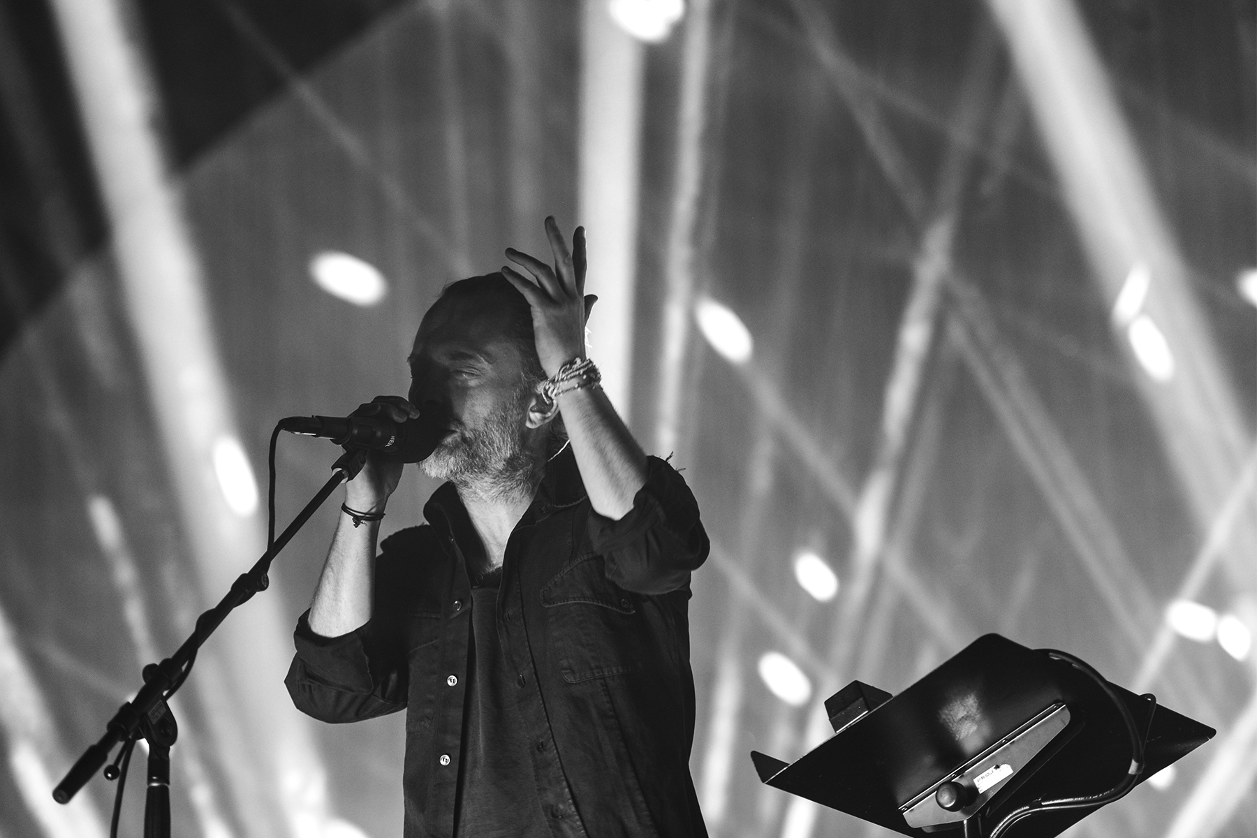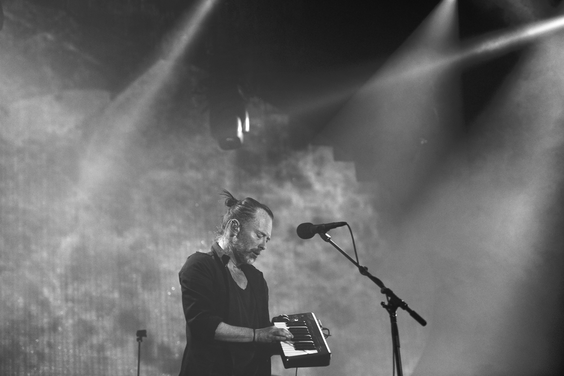 Though they play a somewhat different setlist every night, so much care seems to get in the structure and sequence of every Radiohead show, and with opener “Daydreaming,” they eased into their performance with a subtle, dreamy build, offsetting the elation and awe of the moment of realization that I was, in fact, seeing this larger-than-life band in person once more. Manipulating something electronic from a stand, Thom Yorke exuded his sort of hyper-focued otherworldliness while, like the rest of the band, so seamlessly evaporating in the dense, hypnotic, and so flawlessly recreated soundscapes of the band’s lush catalogue. By third tune “Ful Stop,” Yorke was making a tiny handheld keyboard look cooler than anyone else I’ve ever seen attempt such a feat, and moving straight from the new songs to “Airbag,” the opener from perhaps the band’s most famous album, 1997’s OK Computer, left my jaw on the floor.